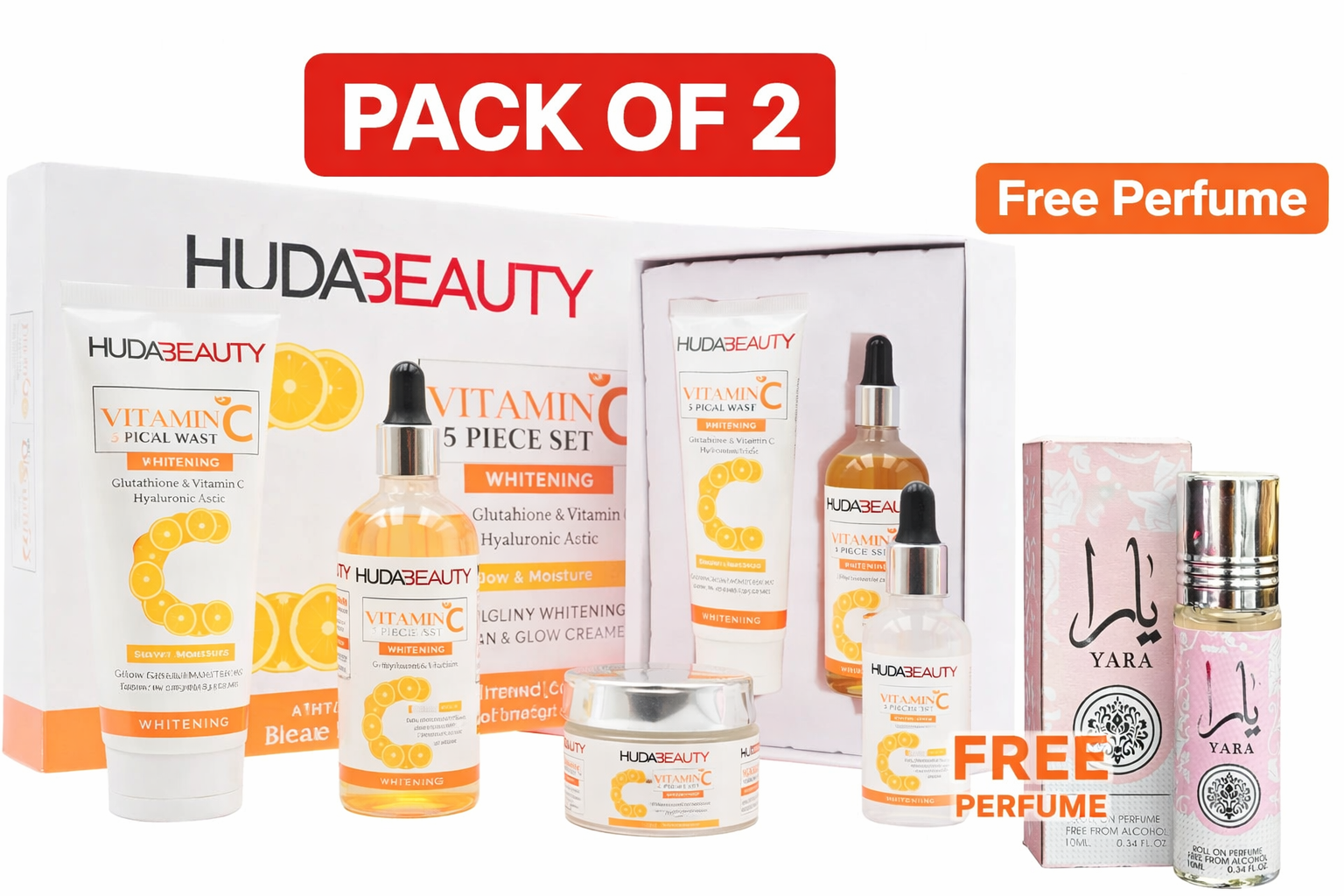 مجموعة هدى بيوتي للعناية بالبشرة بفيتامين سي لتفتيح البشرة – 5 في 1 للعناية الكاملة بالوجه