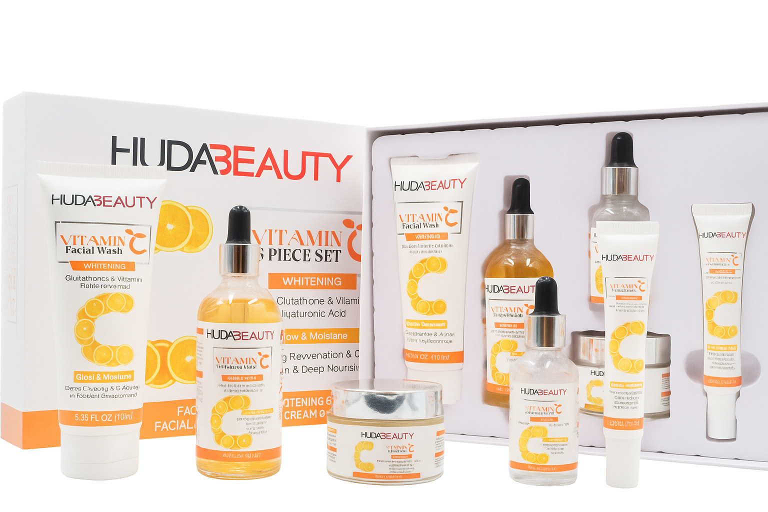 ✨ Reveal your natural glow with the HUDA BEAUTY Vitamin C Whitening Skincare Set. This premium 5-in-1 facial care kit is specially formulated with Vitamin C, Glutathione & Hyaluronic Acid to brighten, hydrate, and rejuvenate your skin.